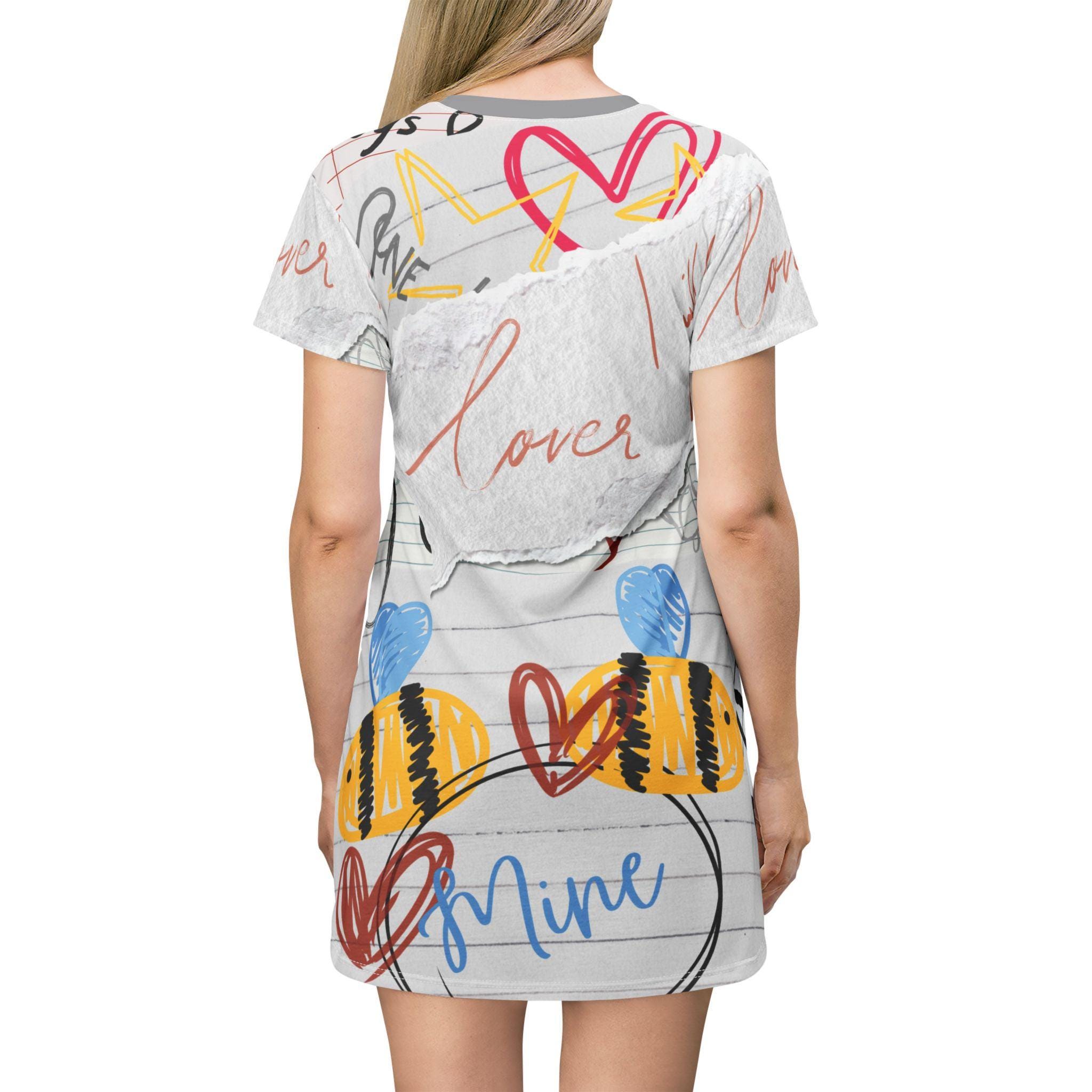 A cute Love Notes T-Shirt Dress perfect for casual wear in the summer. This dress features a cute bee print design, making it an ideal Valentine’s Day outfit. It is a great gift for her and offers a comfortable fit for everyday wear. Relevant for those looking for a fun and playful dress for special occasions or everyday wear.Product features- 100% Polyester fabric for strength and quick drying- Side seams for shape retention and support- Self fabric binding for durability- Tagless for added comfort- Light fabric weight suitable for summerCare instructions- Do not dryclean- Do not iron- Tumble dry: low heat- Do not bleach- Machine wash: cold (max 30C or 90F), gentle cycle