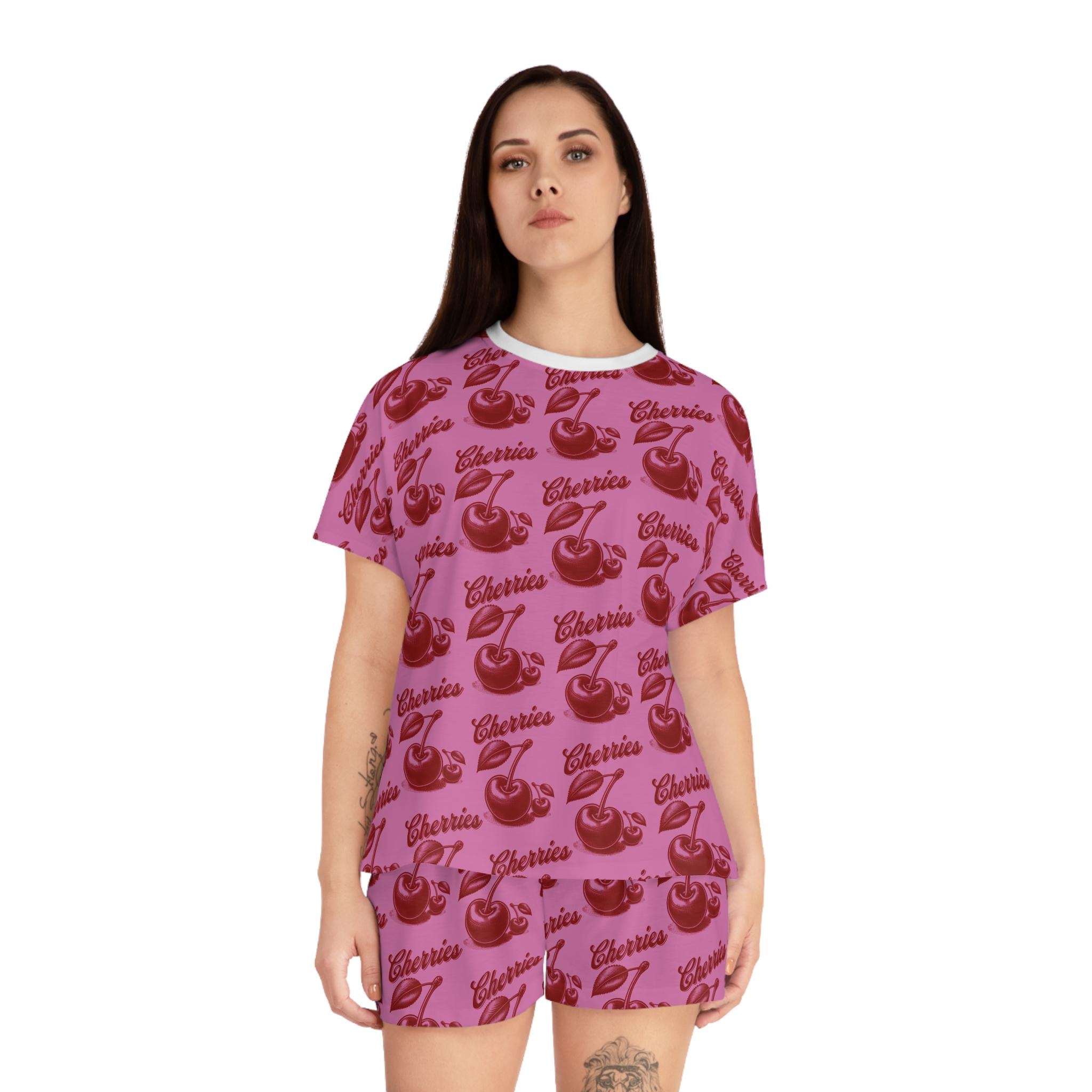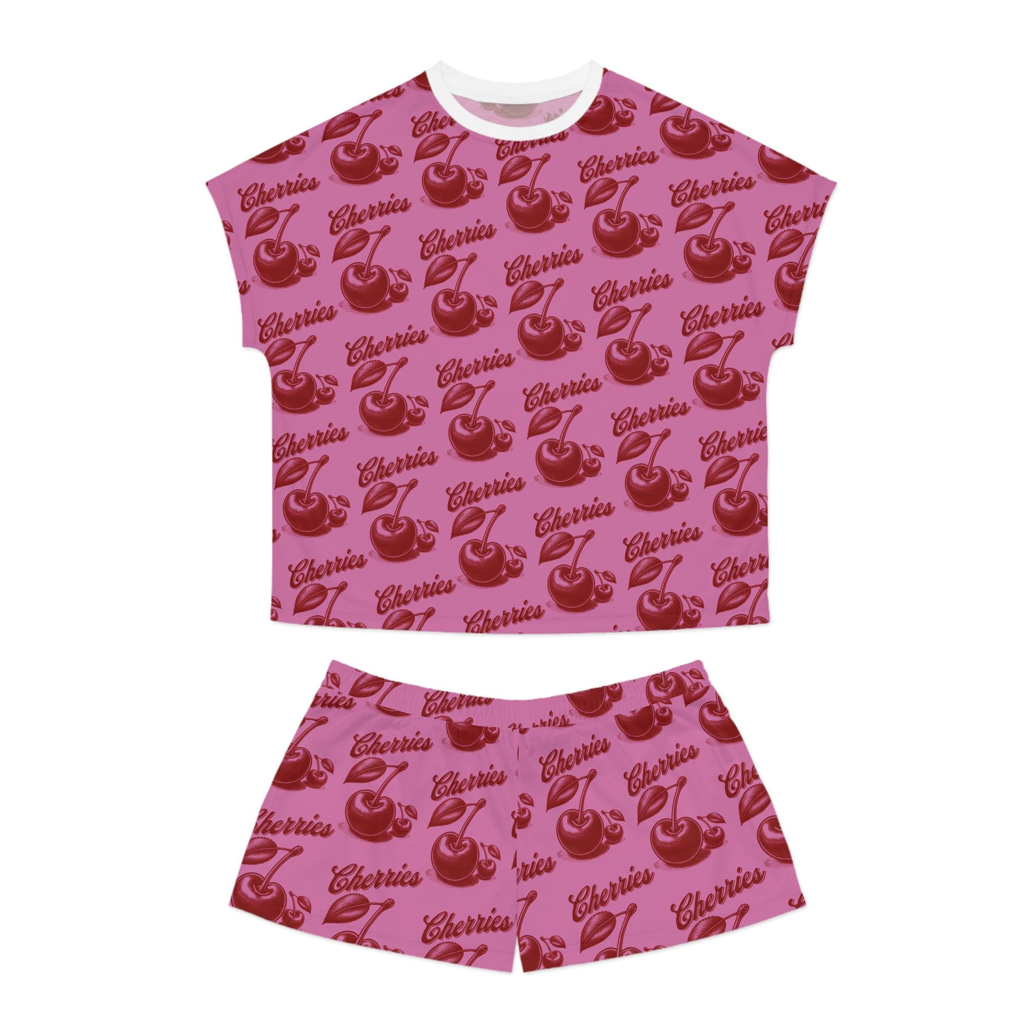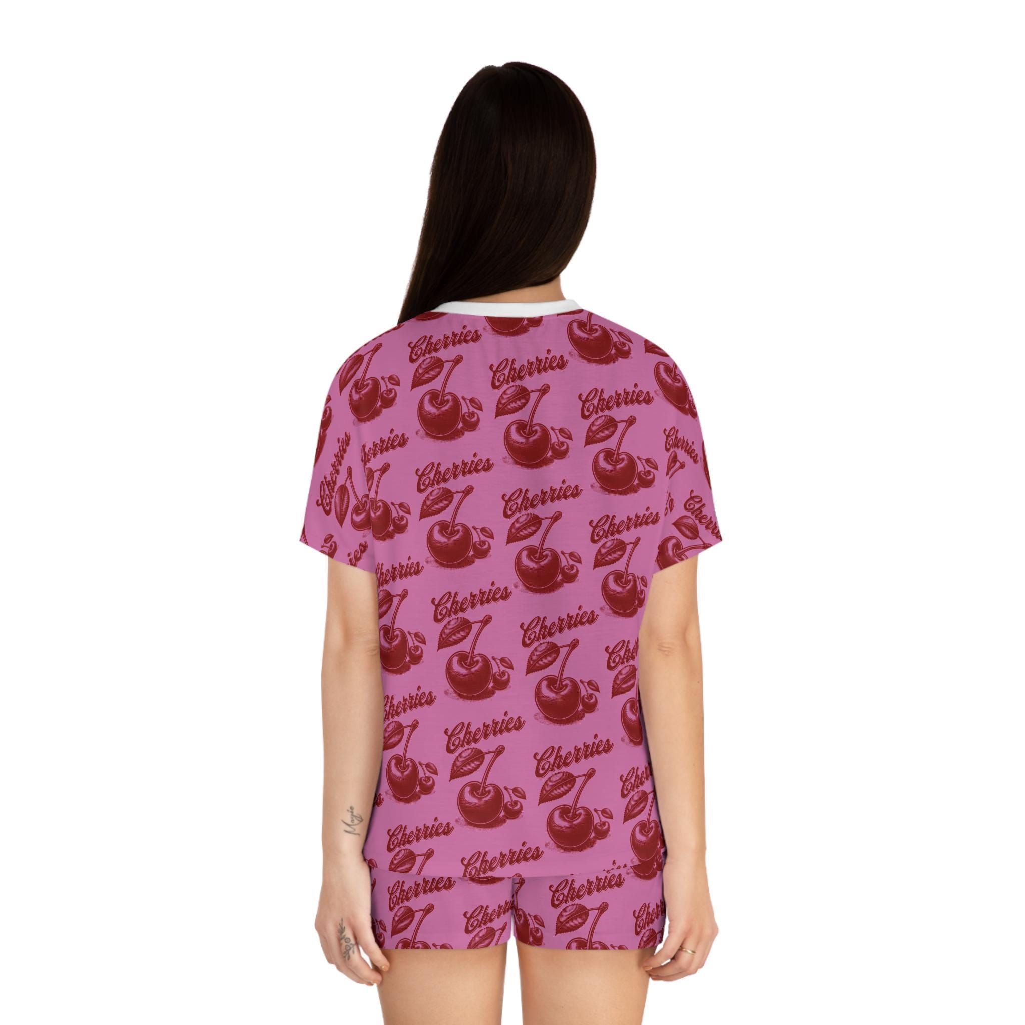 Stay cozy and cute in these cherry-themed pajamas. Made with a soft polyester and cotton blend, these pajamas feature a ribbed collar, elastic waistband, and a relaxed fit for ultimate comfort. Perfect for women looking for a fun and stylish sleepwear option.