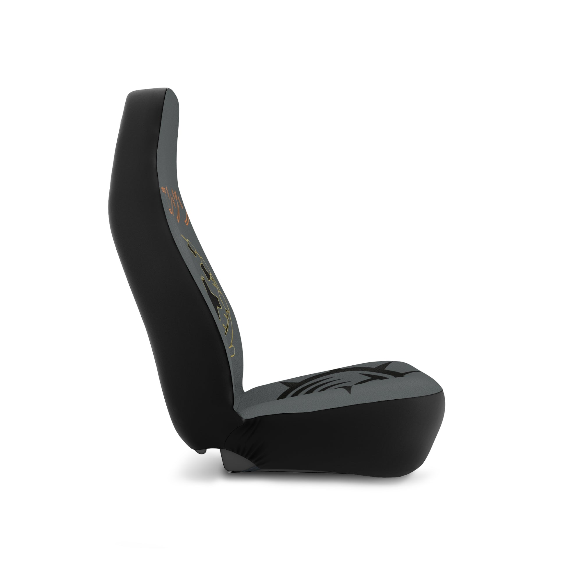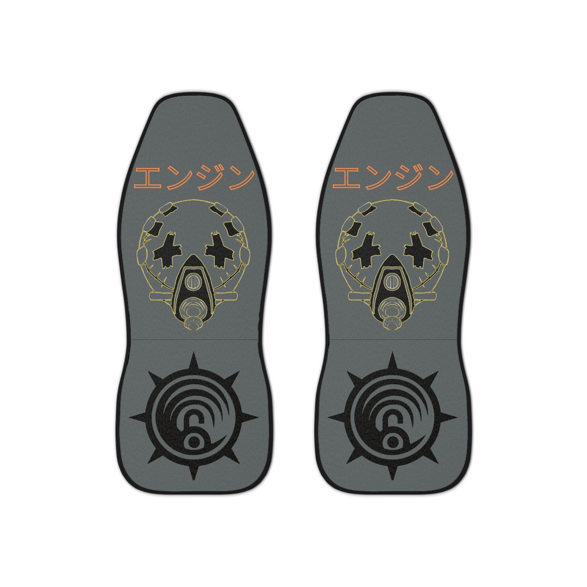 Slide these covers on and feel the cabin hum with a low, mechanical heartbeat. Matte charcoal fabric carries a worn-industrial emblem — a gas‑masked skull framed by chainwork, with a compass-like sigil on the seat base and angular Japanese text above. The muted gold and black palette reads tough but refined, giving your car an intentional, lived-in edge. These covers soften the daily grind: hands rest on plush fabric while your interior stays defended from spills and fading. They look at home on a commuter’s rig or a weekend builder’s truck, bringing a quiet, gritty personality without shouting. Install in minutes, secure with the elastic hooks, and enjoy a seat that feels considered every time you climb in.